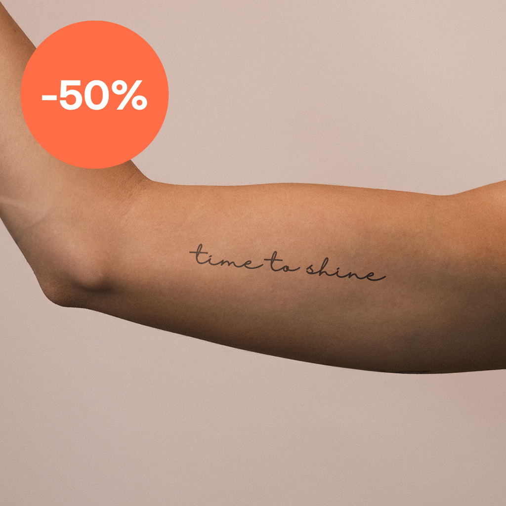 Tijd om te stralen - De tijdelijke tattoo die jouw innerlijke stralingskracht tot uiting brengt Inspiratie en betekenis: De tattoo "Tijd om te stralen" belichaamt de inspirerende boodschap dat het tijd is om jouw ware geluk en innerlijke stralingskracht te laten bloeien. Het symboliseert het moment waarop je uit de schaduw stapt en de wereld jouw unieke licht laat zien. Of je nu geïnspireerd wordt door culturele wortels, historische referenties of persoonlijke verhalen, deze tattoo moedigt je aan om je eigen pad te bewandelen en je passies met zelfvertrouwen te beleven. Aanbevolen plaatsing: Deze veelzijdige tattoo kan op verschillende delen van het lichaam gedragen worden, afhankelijk van hoe jij jouw innerlijke stralingskracht tot uiting wilt brengen. Voor grotere oppervlakken zoals de borst of de rug is "Tijd om te stralen" een indrukwekkende verklaring die jouw persoonlijkheid benadrukt. Als je het liever subtieler wilt, kun je deze tattoo ook op kleinere, fijnere plekken zoals achter het oor of in de ribbenkast plaatsen. Zo kun je het openlijk tonen of als een geheim symbool van jouw innerlijke kracht dragen. Stylingtips: De "Tijd om te stralen" tattoo is een veelzijdig accessoire dat perfect past bij jouw persoonlijke stijl. Combineer het met een casual outfit voor een relaxte, maar toch krachtige uitstraling. Als je je wilt stylen voor een chique diner of een feest, voegt deze tattoo een vleugje verfijning toe aan jouw outfit. Voor speciale gelegenheden zoals verjaardagen of stedentrips geeft het jouw look dat beetje extra en trekt bewonderende blikken aan. Laat je leiden door jouw creativiteit en vind jouw eigen unieke stijl om de "Tijd om te stralen" tattoo te laten stralen. Voor wie is de tattoo geschikt: Deze tattoo is bedoeld voor iedereen die zijn innerlijke stralingskracht wil benadrukken zonder zich permanent te laten tatoeëren. Het is gericht op jonge mensen die individualiteit en zelfexpressie waarderen en die zich willen losmaken van conventionele normen. Of je nu een festivalganger bent die zijn vrijheid en levensvreugde viert, of een zakenvrouw die haar kracht en vastberadenheid toont - de "Tijd om te stralen" tattoo past perfect bij jouw interesses en gelegenheden. Het is de ideale keuze voor iedereen die een tijdelijke tattoo wil uitproberen om zijn eigen stijl uit te drukken en zijn persoonlijkheid te laten stralen. Met de "Tijd om te stralen" tattoo van Inkster geef je jouw uiterlijk een unieke touch en laat je de wereld zien wie je echt bent. Kies deze tijdelijke tattoo om jouw innerlijke stralingskracht te benadrukken en met zelfvertrouwen te leven. Durf op te vallen en jouw moment te gebruiken om te schitteren!